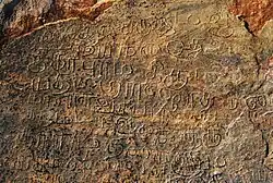 Most Vijayanagara inscriptions recovered so far are in Kannada, Telugu and Tamil, and a few in Sanskrit.[128] According to Suryanath U. Kamath about 7000 stone inscriptions, half of which are in Kannada, and about 300 copper plates which are mostly in Sanskrit, have been recovered.[129] Bilingual inscriptions had lost favor by the 14th century.[130] According to Mack, the majority of the inscriptions recovered are from the rule of the Tuluva dynasty (from 1503 to 1565) with the Saluva dynasty (from 1485 to 1503) inscribing the least in its brief control over the empire. The Sangama dynasty (from 1336 to 1485) which ruled the longest produced about one third of all epigraphs inscribed during the Tuluva period.[131] Despite the popularity of Telugu language as a literary medium, the majority of the epigraphs in the language were inscribed in the limited period from 1500 to 1649. Talbot explains this scenario as one of shifting political solidarity. The Vijayanagara Empire was originally founded in Karnataka, with Andhra Pradesh serving as a province of the empire. After its defeat to the Deccan sultanates in 1565 and the sacking of the royal capital Vijayanagara, the diminished empire moved its capital to Southern Andhra Pradesh, creating an enterprise dominated by Telugu language.[132]