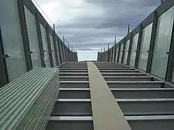 The High Speed Railway line connecting Barcelona and the French border crosses the Municipality of Vilafant 19 ft (6 m) below the ground level. To cross the sunken railroad, two pedestrian bridges were constructed. The structure, with one span of 150 ft (46 m), is monolithically connected with the abutments. The use of unusual geometric shapes fabricated using stainless-steel and GFRP are blended in an innovative fashion, giving rise to an austere and elegant solution.[1][2]