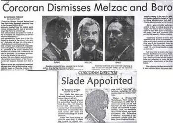 Unfortunately for Melzac, a photograph of Baro's blood-streaming face was published in the New York Times and in Newsweek.[6] Slade recounted, "The photograph of the bloody director was stark evidence that not all was well at the Corcoran."[7] Both Melzac and Baro were dismissed by the Corcoran's board on November 30, 1972.