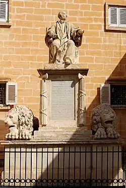 In 1824, he won a competition for the design of a monument to the judge Sir Joseph Nicholas Zammit at the Upper Barrakka Gardens. This might have been the first time a public competition for a monument was held in Malta. The monument consists of a statue of Zammit sitting on a curule seat, set on a high pedestal decorated with fasces. Two stone lions sculpted by Ferdinando Dimech are located near the pedestal.[3] This monumental statue is considered to be one of Dimech's best works.[1]