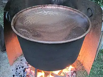 The raw material comes from any of the red and white grapes of the region, particularly damaged bunches, and may include the pomace left over from normal winemaking. Thus it is a way to ensure that none of the harvest is wasted. This material is crushed and cooked in a large cauldron over a fire for 24 hours, which gives its characteristic aromas. Traditionally two men attended it, taking turns to sleep and constantly stirring and skimming off the scum that formed on the surface. The must is cooked until a half or a third of the volume remains, depending on how sweet it is to be. In the Marche some add a quince for every quintal of must to flavor the drink. Once cooled, the must is transferred to oak or chestnut casks where it is left to ferment. It is racked off the lees once or twice.