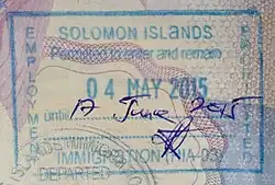 Holders of passports of the following countries and territories may enter Solomon Islands with a free visitor permit on arrival for up to 3 months within any 1-year period:[5][6]