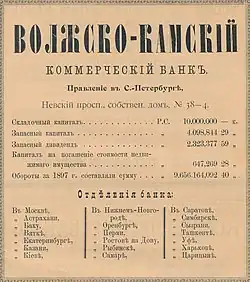 The Volga-Kama Commercial Bank (sometimes Volzhsko-Kamsky Commercial Bank, Russian: Во́лжско-Ка́мский коммерческий банк), often referred to simply as the Volga-Kama Bank, was a major commercial bank of the Russian Empire. Founded in 1870, it was Russia's largest private-sector bank by total assets at the start of the 20th century.[1]: 43  In late 1917 following the Russian Revolution, like all other commercial banks in Russia, it was absorbed into the State Bank with no compensation to its shareholders.[2] Its name refers to the rivers Volga and Kama.