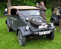 The Volkswagen Type 82 Kübelwagen (listen), or simply Kübel,[2] contractions of the original German word Kübelsitzwagen (translated: 'bucket-seat car' — but when the contractions are translated literally a back-formation of 'bucket' or 'tub'-car results),[3] is a military light utility vehicle designed by Ferdinand Porsche and built by Volkswagen during World War II for use by the Nazi German military (both Wehrmacht and Waffen-SS). Based heavily on the Volkswagen Beetle, it was prototyped and first deployed in Poland as the Type 62, but following improvements entered full-scale production as the Type 82. Several derivative models, such as the Kommandeurswagen, were also built in hundreds, or in dozens.