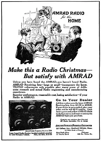 - ^ "AMRAD Radio" (advertisement), Popular Radio, December 1922, page 5.
