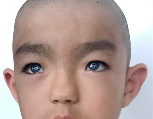 Type 1 is characterised by congenital sensorineural hearing loss, pigmentary deficiencies of the hair such as a white lock of hair (poliosis) in the front-centre of the head or premature greying, pigmentary deficiencies of the eyes such as different-coloured eyes (complete heterochromia iridum), multiple colours in an eye (sectoral heterochromia iridum) or brilliant blue eyes, patches of skin depigmentation, and a wider gap between the inner corners of the eyes called telecanthus or dystopia canthorum. Other facial features associated with type 1 can include a high nasal bridge, a flat nose tip, a unibrow (synophrys), smaller edges of the nostrils (alae) or a smooth philtrum.[1]