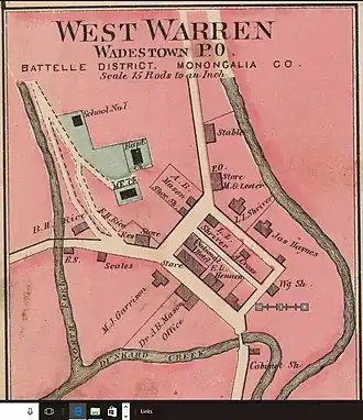 Wadestown — formerly West Warren — is an unincorporated community in Monongalia County, West Virginia, United States, on West Virginia Route 7 approximately 7.5 miles (12.1 km) west-southwest of Blacksville.