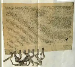 Under the new abbot, Abbot John, the abbey sought the return of those lands. The case appears to have gone to Bishop Walter's consistorial court, which he held at the chapel of Innerpeffry. Here Naomhán and Mairead agreed to accept a payment of 40 marks in exchange for returning the documents of ownership given to them by the abbot and for acknowledging the abbey's ownership. The couple pledged to honour the agreement by swearing an oath on the chapel's Gospels.[38] The case then proceeded to a hearing held under Robert Stewart, Earl of Strathearn and High Steward of Scotland (later King Robert II), at Perth, where the couple were forced under the threat of severe penalties to swear again never to renew their claim.[39] The decision was sealed by the witnesses, including Bishop Walter, at a Perth church on 30 November 1365.[40]