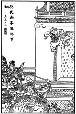 Wang Yun commits suicide in front of Li Jue and Guo Si. Print from a Qing dynasty edition of the novel Romance of the Three Kingdoms.