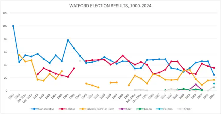 The seat has been a bellwether of the national result since February 1974, and since 1945 has only voted against the winning party twice: in 1951 and 1970. Watford saw considerable Liberal Democrat opposition in 2005, achieving second place, taking many Labour votes with the Conservative candidate close behind.[4]
