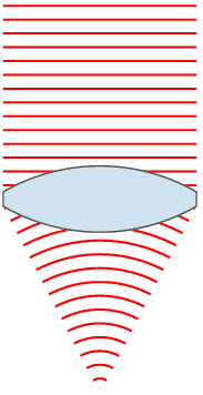For a sinusoidal plane wave, the wavefronts are planes perpendicular to the direction of propagation, that move in that direction together with the wave. For a sinusoidal spherical wave, the wavefronts are spherical surfaces that expand with it. If the speed of propagation is different at different points of a wavefront, the shape and/or orientation of the wavefronts may change by refraction. In particular, lenses can change the shape of optical wavefronts from planar to spherical, or vice versa.