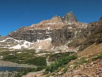 Wenkchemna Peak is composed of sedimentary rock laid down during the Precambrian to Jurassic periods. Formed in shallow seas, this sedimentary rock was pushed east and over the top of younger rock during the Laramide orogeny.[6]