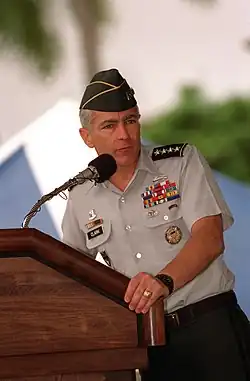 Army regulations set a so-called "ticking clock" upon promotion to a three-star general, essentially requiring that Clark be promoted to another post within two years from his initial promotion or retire.[44] This deadline ended in 1996 and Clark said he was not optimistic about receiving such a promotion because rumors at the time suggested General Dennis Reimer did not want to recommend him for promotion although "no specific reason was given".[45] According to Clark's book, General Robert H. Scales said that it was likely Clark's reputation for intelligence was responsible for feelings of resentment from other generals. Clark was named to the United States Southern Command (USSOUTHCOM) post despite these rumors. Congress approved his promotion to full general in June 1996, and General John M. Shalikashvili signed the order. Clark said he was not the original nominee, but the first officer chosen "hadn't been accepted for some reason".[45][46]