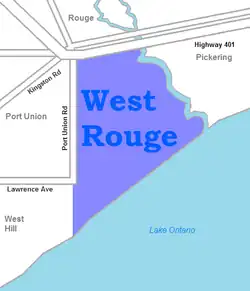West Rouge is a neighbourhood in Toronto, Ontario, Canada. It is located in the south-east corner of Toronto, within the former city of Scarborough. The community is roughly bounded by Lake Ontario to the south, the Rouge River and the Rouge National Urban Park to the east, Port Union Road to the west and Kingston Road to the north.