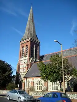 Notable Victorian buildings include Heene Terrace (built 1865), the Burlington Hotel (built 1865), St Botolph's Church (built 1872−73), the Italianate West Worthing railway station (built 1889), the Queen Anne style Downview Hotel (now flats, built 1891) and St Matthew's Church (built 1898−1900).[10] Dolphin Lodge (completed 1922−23) was begun in 1893 as the Hotel Metropole and was intended to be significantly grander, as the centrepiece of the new town of West Worthing. According to the original plans, the hotel would have had a south elevation wider than Buckingham Palace.[11] Following a recession, the front and west wings were never built. The building would have overlooked a pier for West Worthing.[12]