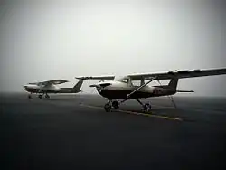 The SkyBroncos' two aircraft, N3258V[16] and N6226K,[17] a 1975 and 1976 model year Cessna 150 are both owned and maintained by Western Michigan University, however are operated solely by the SkyBroncos.[18] Each aircraft is powered by a Continental Motors O-200 reciprocating engine. Lines of white paint are frequently applied to the tires of each aircraft to help identify where on the runway the aircraft touches down.