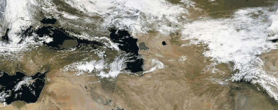 A western disturbance moving east towards the Indian subcontinent. It can be seen as a cloud patch originating from the Black Sea, progressing east thereafter.