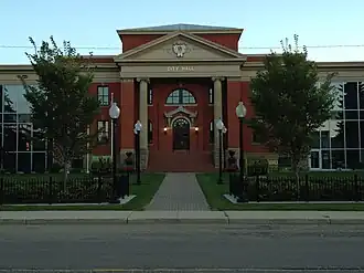 The Wetaskiwin Court House is a large two-storey flat-roofed building made of brick and sandstone. The front face has a projecting pediment featuring the provincial crest and the date of its construction, 1907 supported by brick piers and two ionic pillars.[1] The entrance below has semi-circle windows both in the tympanum and overtop the doorway.[2] The exterior shows ornamental elements such as lintels, sills, and pilasters as well as both round-arched and single-hung windows with sandstone keystones. The building has been renovated to include two new ells with large glass-panel windows on either side of the original structure for more auxiliary space.