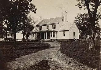 During the Peninsula Campaign, Frederick Law Olmsted, designer of New York City's Central Park among his many accomplishments, served as Executive Secretary of the U.S. Sanitary Commission, a precursor to the Red Cross in Washington D.C. which tended to the Union wounded during the Civil War. Olmsted headed the medical effort for the sick and wounded at White House Landing until McClellan abandoned it as he retreated with his troops during the Seven Days Battles and shifted his base to Harrison's Landing on the James River. The White House was burned by retreating Union troops.[12] This was not the original White House Mansion. The original White House Mansion built by Col. John Lightfoot III had been removed to "make way for the structure which stood on the same site and burned on June 27, 1862".[1]