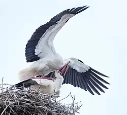 Several bird species often nest within the large nests of the white stork. Regular occupants are house sparrows, tree sparrows, and common starlings; less common residents include Eurasian kestrels, little owls, European rollers, white wagtails, black redstarts, Eurasian jackdaws, and Spanish sparrows.[86] Active nests may attract insectivorous birds such as swallows, martins, and swifts, where they prey on insects flying around.[87] Paired birds greet by engaging in up-down and head-shaking crouch displays, and clattering the beak while throwing back the head.[8] Pairs copulate frequently throughout the month before eggs are laid. High-frequency pair copulation is usually associated with sperm competition and high frequency of extra-pair copulation. It has been considered that extra-pair copulation rates were low but a 2016 DNA sample study suggests that extra-pair copulation occasionally occurs in white storks.[88][89][90] Despite the relatively high extra-pair paternity occurrence compared to other long-lived monogamous birds, white storks form strong pair bonds and high nest fidelity maintained across years.[17][91]