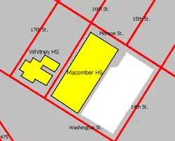 Harriet Whitney High School was a girls vocational public high school in Toledo, Ohio from 1939 to June 1991. It served the entire city and was part of the Toledo Public School District. In 1959, the school became joint-operational with Macomber High School,[2] an all-boys vocational school located next door, and the two buildings came to be known as Macomber-Whitney. Despite the fact that they shared an urban campus and some operational efficiencies, the two schools were completely separate in faculties, enrollments, and curriculum until the 1973-1974 school year. In the spring of 1972, an assembly was held for Macomber sophomores. They were told that they could major in one of several programs offered at Whitney, taking core courses at Whitney and other courses required for graduation at Macomber. The available programs included Distributive Education, Business Technology, Marketing, and Data Processing. Some 50 boys signed up. The only change from the assembly announcement was that the boys were transferred completely to Whitney. While the faculty and staff at Whitney had to make some adjustments to accommodate the boys, the program change worked well. The boys did have to undergo some questions from peers, some of whom didn't believe they actually attended Whitney (the most common response was "you mean, Whitmer?"—Whitmer being another co-ed high school in the metro Toledo area. And, even after the former Macomber boys were completely and fully registered as Whitney students, the school newspaper (Whit-Miss) and the yearbook (First Lady) kept their original names from when Whitney was a girls-only school.