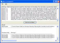 Who Is To Blame is a utility that processes warnings and errors from Microsoft Visual Studio. It utilises the Subversion (SVN) Blame tool to generate a report identifying which software developer added or amended the line that caused the warning or error. It is free software released under the GNU General Public License and uses SVN and the Microsoft .NET Framework 3.5.