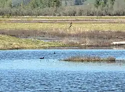 The Portland/Vancouver Basin ecoregion (named for the cities of Portland and Vancouver) is a geological depression at the base of the Portland Hills fault-block. It contains the confluence of the Willamette and Columbia Rivers and is composed of deltaic sands and gravels deposited by Pleistocene floods, notably the Missoula Floods. Elevation varies from 0 to 300 feet (0 to 90 m), with buttes as high as 650 feet (200 m). Historically, the basin was characterized by Oregon white oak groves and Douglas-fir forests on the uplands; black cottonwood groves on riverbanks and islands; Oregon ash, red alder, and western redcedar in riparian areas; and prairie openings maintained by Native American burning, with camas, sedges, tufted hairgrass, fescue, and California oatgrass. Numerous wetlands, oxbow lakes, and ponds can still be found, but today the region is dominated by urban and suburban development, pastures, cropland, and tree farms. The climate is usually marine-influenced, but easterly winds from the Columbia River Gorge periodically bring continental temperature extremes. The region covers 305 square miles (790 km2) in Washington and 269 square miles (697 km2) in Oregon, including the northern and eastern suburbs of the Portland metropolitan area. It contains several National Wildlife Refuges within the Ridgefield National Wildlife Refuge Complex.[2][3]