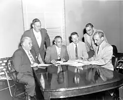 ![]() Washburne (left) with J. Frank Houghton, Donald C. McLaren, Fred C. Petersen, Henry S. Bartholomew and B. E. Shaffer, 1953 | |