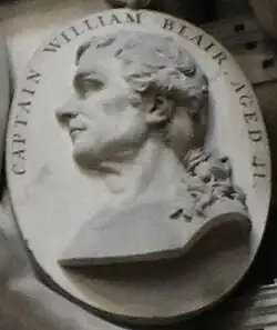 A monument to Captain William Blair's memory, jointly with his fellow officers, Captains William Bayne and Lord Robert Manners, was designed by Joseph Nollekens and erected by order of Parliament in Westminster Abbey at the public expense.[5][6][7][8][9][10] The 25 ft (7.6 m) high marble monument was not completed till 1793. It consists of a figure of Fame standing atop a column which has relief portraits of the captains attached, above figures of Britannia and a lion opposite figures of Neptune and a sea-horse.[6]