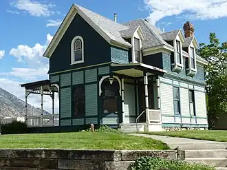 A turquoise blue, the William D. Alexander house is one of the most unusual homes in the city of Provo, Utah, and it is significant for more than Its color. The Alexander house emphasizes an architectural style known as "The stick style." An expression very popular in America throughout the nineteenth century, the Stick Style was an architectural expression which left the frame system of the home exposed. "The development of the balloon frame advanced the articulation of the structural skeleton and eventually the style became a conscious multiplication of sticks as decorative elements. The Alexander House demonstrates this decorative (more than structural) application, with horizontal and vertical sticks that frame the ground floor windows and doors, and the dormers of the second story. The geometric pattern of crossing horizontal and vertical sticks on this house is reminiscent of Japanese framing as seen in the 1876 Centennial Exhibition in Philadelphia which influenced the Stick and later Prairie styles, and may have been an influence in this house (Hartman p. 1)." The home is still very well preserved and stands strong today. The exterior has been repainted different colors over the years.[4]