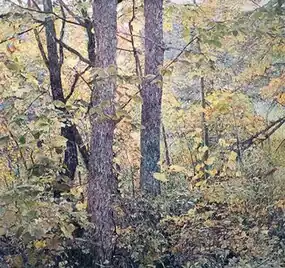 Curator John Arthur emphasizes Nichols's framing of the landscape with close, screen-like, enveloping views that often lack contextual clues such as horizon, and merely hint at the expanses beyond with light penetrating dense enclosures of thicket and foliage (e.g., Along a Road in Door County, 2016).[2][4][31] Nichols enhances the effect with scale to create a sense for viewers of being surrounded rather than approaching scenes frontally.[20][23] Scale plays a further role in how his paintings are perceived. At a proper distance, his gestural brushstrokes and loose stains of wet, transparent color coalesce and sharpen into true-to-life images of light, atmosphere and organic form at a proper distance; up close, they dissolve into lyrical, abstract patterning in works such as Reflected Fall (2004)[32] that American Arts Quarterly wrote "might appeal on abstract terms to admirers of Jackson Pollock."[3][4][1][6] Describing the effect, Carter Ratcliff wrote "an insistent but light, transparent touch covers surface with patterns which, at a distance, resolve into flurries of blossoms and leaves" and a "delicately brooding quality."[15]