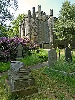 The foundation stone of this church was laid on 25 July 1868 by Rev. Charles Musgrave,[94] and it was consecrated on 25 February 1870.[95][96] It had two 1871 stained glass windows by Edward Burne-Jones and other windows by Dante Gabriel Rossetti and Ford Madox Brown. The remains of these windows are now at Cliffe Castle Museum.[97] When opened it had a west window with heads of four evangelists and four prophets, a bell turret, a sedilia, lectern, chancel tiles, pulpit and font.[95] The building was demolished in the 1970s.[97][98][nb 5]