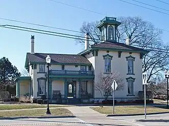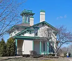 The Upton House is a two-story Italianate-style house constructed of brick with a hipped roof and tall cupola.[2] The brick construction indicates the relative affluence of the builder. The exterior is painted and heavy brackets support the eaves. Windows are tall, double-hung, four-over-four lights; the ones on the front facade feature ornate stone hoods while windows on the other sides have brick hoods. A 1+12-story, gable-roofed addition is located on one side, and a flat-roofed, single-story addition is on another. The cupola, porches, chimneys, and bay window balustrade were reconstructed during the 1981-82 renovation.[2]