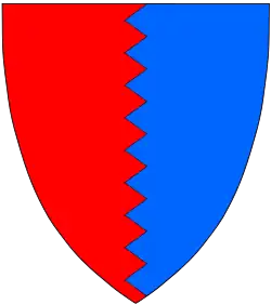 Arms of William V de Braose (d.1230), as drawn by Matthew Paris (c.1200–1259) in his Historia Anglorum (folio 116): Party per pale indented gules and azure[5]