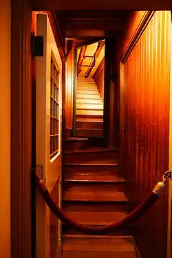 The seven-story tower and most of the chimneys collapsed. One entire wing was destroyed along with the third and fourth story additions. Winchester had the rubble removed but had little more done to the property after the earthquake.[5] It left doors that opened to nothing where balconies had once been, pipes that were protruding from what were once window boxes, and staircases that once led to upper floors ending suddenly.[18]