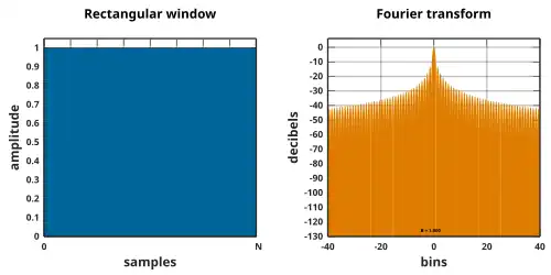 The rectangular window (sometimes known as the boxcar or uniform or Dirichlet window or misleadingly as "no window" in some programs[18]) is the simplest window, equivalent to replacing all but N consecutive values of a data sequence by zeros, making the waveform suddenly turn on and off: