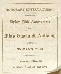 Program from the 85th anniversary for Susan B Anthony by the Woman's Club of Albuquerque.