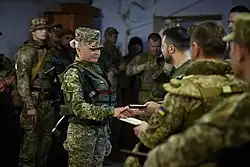 Since the beginning of the Russo-Ukrainian War in 2014, there has been a significant increase in women's roles in the Ukrainian military, including several positions that had previously been reserved only for men being opened up to women, resulting in the total number of women serving more than doubling.[8] Ukrainian woman have served in the armed forces since World War I, but were only officially recognized as combat veterans with full military pensions in the Soviet era and, later, after the start of the war in Donbas in 2014.[9]