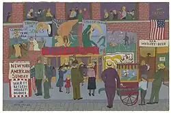 Gaylor's late painting "Fourteenth Street" (shown at right) revisits a scene from 1917 in Manhattan and shows a social-conscience side of his approach to art. A curator noted: "The image resounds strongly as a slice of life from a busy New York thoroughfare from the 1910s. Clearly, Gaylor is equating the sordid message in the movie "Traffic in Souls" with the oppressive workload of the seamstresses, whose sweatshop labors provide the attire of the well-dressed group in the lower half of the picture. At times a sharp social commentator, Gaylor is keenly aware not only of the pleasurable pastime of movie going, but also the toil of the less fortunate." In 1962 Gaylor's widow showed works of his in a barn adjacent to the house they had shared and where she still lived.[37] The following year, the Zabriskie Gallery mounted a retrospective exhibition of paintings and works on paper. A critic for the New York Times said the works shown were "full of clever anecdotes and witticisms smuggled in under a naïve deadpan" and added that the Greenwich Village Bohemianism which was their subject would be difficult to depict in any other manner.[38] Works by Gaylor appeared in group shows in 1964 and 1978 and then in another retrospective in 1979.[39][40] The 1979 show, at Gallery Odin, in Port Washington, New York, mixed Gaylor's paintings with paintings by his wife, the artist, Adelaide Lawson, and works the two of them had purchased or been given by artist friends.[3] Two other retrospectives appeared in 2021, one, a traveling exhibition that began at the Heckscher Museum of Art in Huntington, New York, and the other at Bernard Goldberg Fine Arts in Manhattan.[2][3]