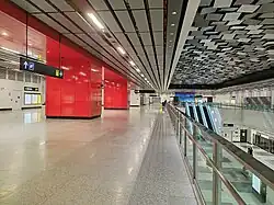The station's interior has a red and white scheme that was inspired by the National Flag of Singapore, to welcome visitors coming from Malaysia into the country. The station also features aluminium ceiling panels above the platforms which mimic the movements of the daily flux of commuters.[33] The station has a much larger size compared to other MRT stations, as the station was set to accommodate the peak-hour traffic for travellers between Singapore and Johor Bahru.[34] There are two exits from the station.[35]