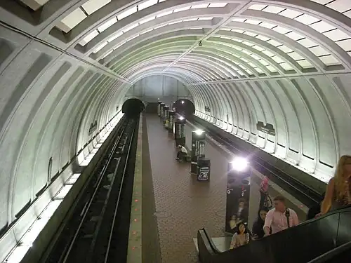 Like other stations on the Red Line constructed with rock-tunneling methods, it is rather deep, at 150 feet (46 m) below ground. After Forest Glen, it is the second deepest station in the system.[4][5] The escalators have a vertical rise of 102 feet (31 m); they are the longest in the District of Columbia and the third longest on the Metrorail system (behind Wheaton and Bethesda).[6]