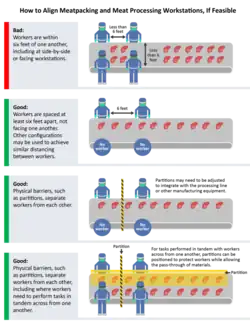 Meat and poultry processing facilities have work environments that may contribute substantially to their potential exposures, as they often work close to one another on assembly lines during prolonged work shifts. For engineering controls, CDC and OSHA recommend configuring communal work environments so that workers are spaced at least six feet apart including along processing lines, using physical barriers such as strip curtains or plexiglass to separate workers from each other, and ensuring adequate ventilation that minimizes air from fans blowing from one worker directly at another worker. For administrative controls, they recommend staggering workers' arrival, break, and departure times, cohorting workers so they are always assigned to the same shifts with the same coworkers, encouraging single-file movement through the facility, avoiding carpooling to and from work, and considering a program of screening workers before entry into the workplace and setting criteria for return to work of recovered workers and for exclusion of sick workers. For personal protective equipment, they recommend face shields and considering allowing voluntary use of filtering facepiece respirators such as N95 masks. They also recommend wearing cloth face masks that should be replaced if they become wet, soiled, or otherwise visibly contaminated during the work shift, although cloth face masks are not considered to be personal protective equipment.[4]