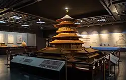 - ^ 《资治通鉴·唐纪·唐纪二十》:辛亥,明堂成,高二百九十四尺,方三百尺。凡三层:下层法四时,各随方色。中层法十二辰;上为圆盖,九龙捧之。上层法二十四气;亦为圆盖,上施铁凤,高一丈,饰以黄金。中有巨木十围,上下通贯,栭栌棤藉以为本。下施铁渠,为辟雍之象。号曰万象神宫。[needs translation]
