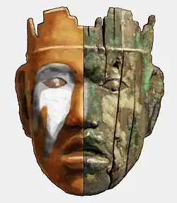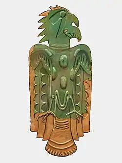 Plate A, the only anthropomorphic human-headed avian plate in the Wulfing cache, measures 30 centimetres (12 in) in length by 13.5 centimetres (5.3 in) in width and weighs 84 grams (3.0 oz).[5] The human head has the Forked Eye Surround motif, Beaded Forelock, ear-spool, Hand Over Mouth motif, and occipital hair knot associated with the "Birdman" of the Mississippian Art and Ceremonial Complex (M.A.C.C.).[6] Among Mississippian copper plates, the naturalistic depiction of the human head of Plate A most closely matches the treatment of the human figures of the Etowah Rogan plates.[2] It also has an elaborate headdress with what may be feathers and a smaller agnathous human face with a forked eye surround motif, ear spools, and a distinctive crenelated crown-like device. This face is similar to an artifact found in a burial in Fulton County, Illinois known as the Emmons mask, a copper covered cedar head with galena painted forked eye motifs and the distinctive crenelated device. This wooden head is thought to be an actual headdress piece worn similarly to how it is portrayed on plate A, and even has holes for attaching it to a headdress in this position.[7][2]