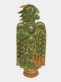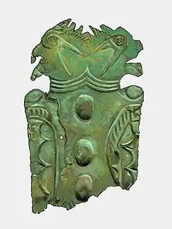 The eight plates are made in the Late Braden style associated with the Cahokia site in western Illinois, the major center of Mississippian culture. They are thought to date to the late 13th or early 14th century.[2] The remains of copper workshops discovered near Mound 34 at Cahokia are so far the only copper workshops found at a Mississippian culture archaeological site.[3] The Wulfing plates depict raptors and bird-human hybrids, with heads ranging from human heads to raptor's heads to double-headed raptors on stylized bird's bodies, with naturalistic bird's claws.[4] The plates were found buried in a field with no known local platform mounds or village sites. They had been considerably used prior to their burial, as each plate shows multiple episodes of aboriginal repair work, including patch repairs and riveted cracks.[5]
