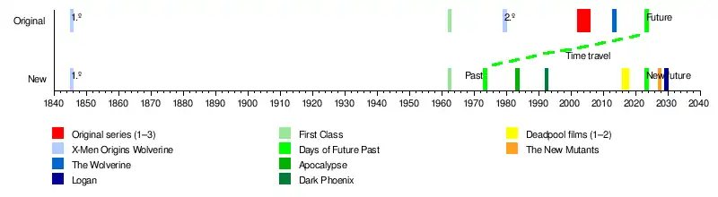 The events of the films are conventionally placed into two main "timelines". The "original" timeline begins with X-Men Origins: Wolverine (though multiple events in this film would be retconned or contradicted in others released afterward) and moving through First Class, the original trilogy and The Wolverine until the dystopian setting of Days of Future Past. Starting from that film's ending, a "new" timeline is created, with the proceeding prequel films Apocalypse and Dark Phoenix showing events differently than what was established before.[126][127]