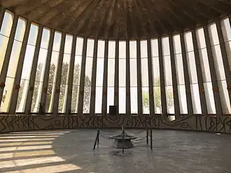 Yad Kennedy (Hebrew: יד קנדי, Kennedy Memorial), located in the Mateh Yehuda Region near Jerusalem, is a memorial to John F. Kennedy, the 35th President of the United States, who was assassinated in Dallas, Texas in 1963. The 60-foot high (18 m) memorial is shaped like the stump of a felled tree, symbolizing a life cut short.[1] Inside is a bronze relief of Kennedy, with an eternal flame burning in the center.[1][2] It is encircled by 51 concrete columns, one for each of the 50 states in the United States plus one for Washington, D.C., the United States capital.[3] The emblems of the states (and of the District of Columbia) are displayed on each of the columns,[3] and the columns are separated by slim panels of glass.[4] The monument measures approximately 250 feet (76 m) in circumference around its base,[4] and there is space within the memorial for approximately 100 visitors at a time.[3] The monument was built in 1966 with funds donated by American Jewish communities.[1]