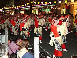 The Yamagata Hanagasa Matsuri is an annual summer festival that lasts from 5 August to 7 August on Friday, Saturday, and Sunday during the first weekend of August. It was first celebrated in 1963 when the parade was a part of the Zaō Summer Festival as an event to attract tourists to Yamagata Prefecture. After some success the parade grew over time into one of the four major festivals of the Tōhoku region.[1] Ten thousand dancers dance to the "Hanagasa Ondo" song in the parade.[2]