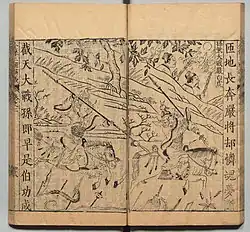 Ming dynasty woodblock print of Sun Ce battling Yan Baihu
