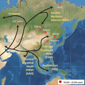 - ^ a b Kozintsev 2022, p.1:"The ancestor of ANE was the ANS (Ancient North Siberian) autosomal component, represented in a male from the Upper Paleolithic Yana site, dating to 31.6 ka BP (Sikora et al., 2019). ANS is thought to have originated among West Eurasians soon after their divergence from East Eurasians about 43 ka BP. The picture is complicated by an approximately 22 % genetic contribution received by early West Eurasians from East Asians shortly after their split.".